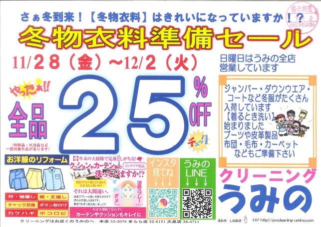 クリーニングうみの 衣替え最終セール! 2024年4月26日 最新情報 by 大柴. 冬物衣料準備セール 11月28日(金)~12月2日(火) 全品 25%OFF 特殊品・外注品など一部対象外品があります。 前の記事