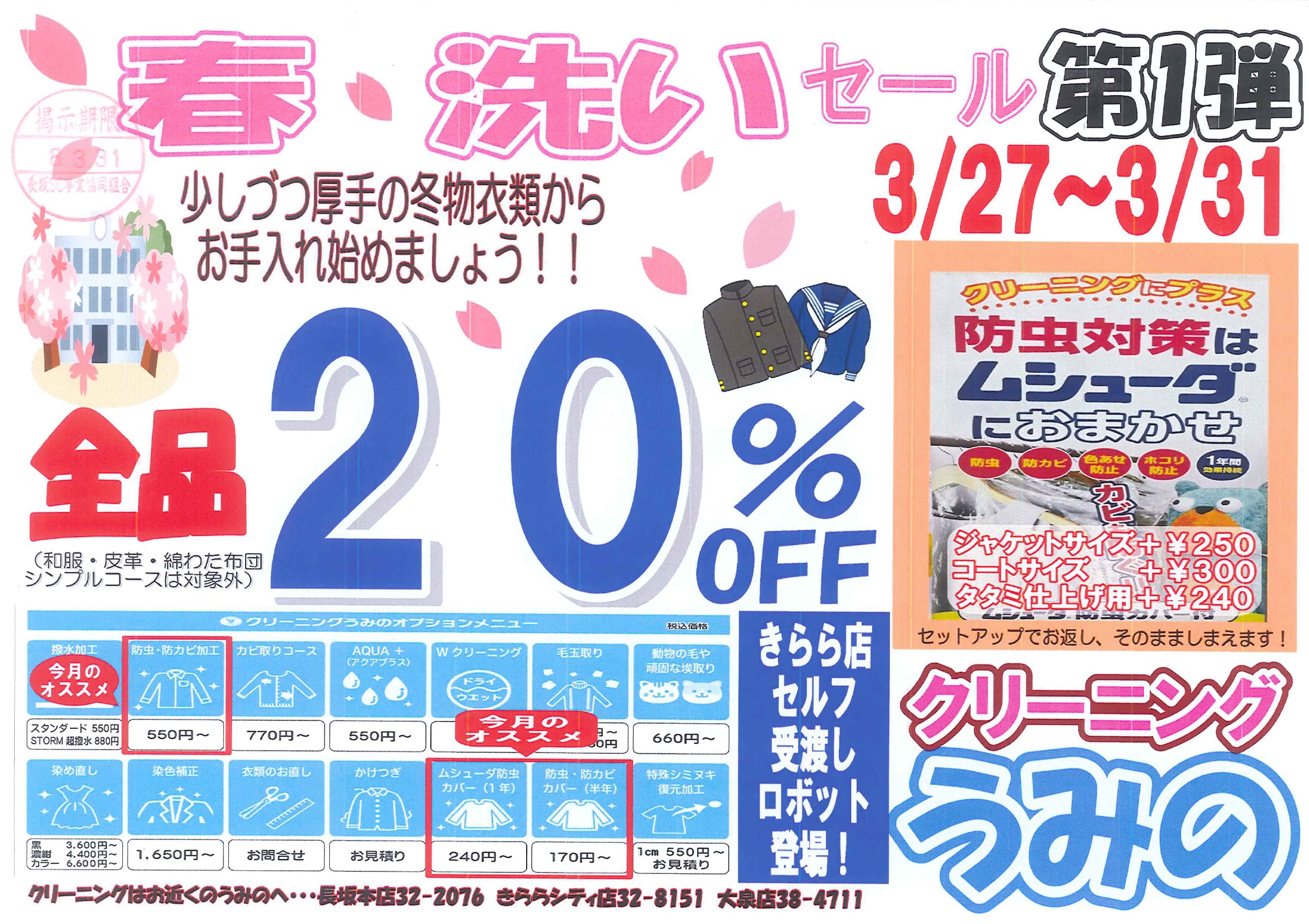 クリーニングうみの 春 洗いセール 第1弾 2024年4月26日 最新情報 by 大柴. 春 洗いセール 第1弾 少しづつ厚手の冬物衣類からお手入れ始めましょう! 3月27日(金)~31日(火) 全品 20%OFF (和服・皮革・綿わた布団シンプルコースは対象外) 前の記事